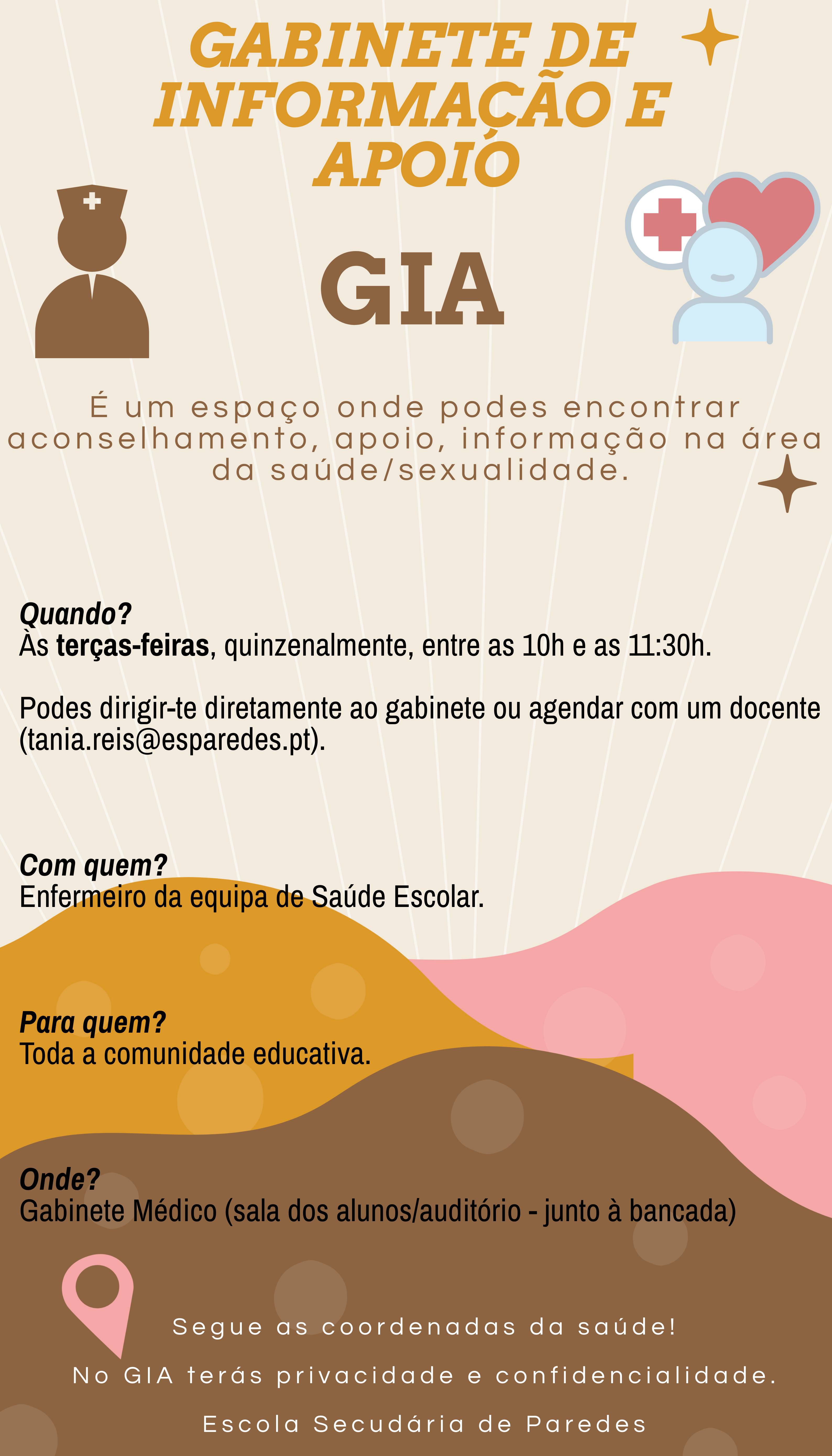 O gabinete de informação e apoio ao aluno (GIA) foi criado no âmbito da educação para a saúde e educação sexual em meio escolar, conforme estabelecido na Lei n.º 60/2009. A equipa de saúde escolar é pluridisciplinar, formada por elementos da área da saúde e por docentes, e é responsável pela gestão do GIA. O enfermeiro é um dos elementos que integra esta equipa. Na Escola Secundária de Paredes, o enfermeiro estará presente, quinzenalmente, às terças-feiras, das 10h às 11.30h, num gabinete onde a privacidade e a confidencialidade estão asseguradas.