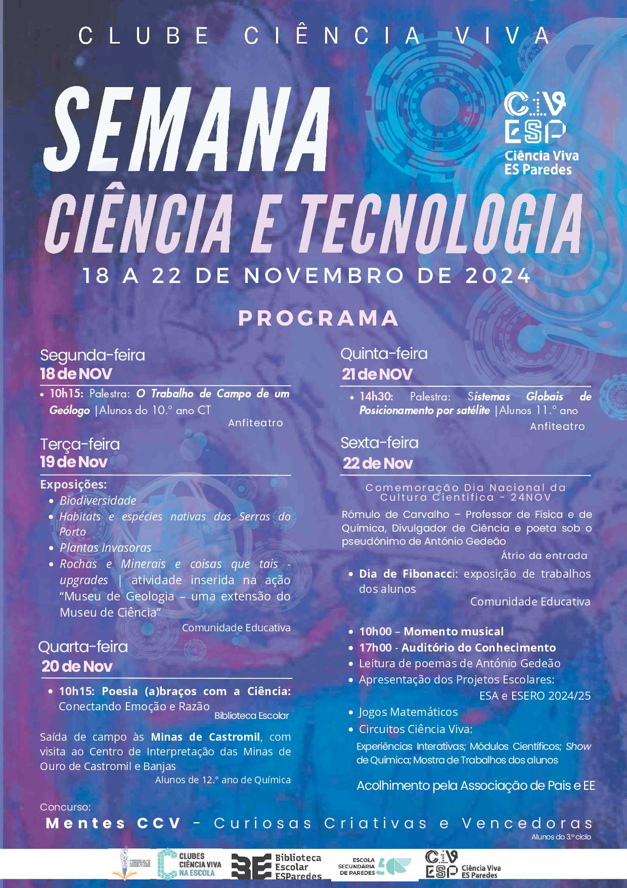 De 18 a 22 de novembro, comemora-se a semana da Ciência e Tecnologia, semana que assinala o Dia Nacional da Cultura Científica, estabelecido a 24 de novembro em homenagem ao professor, poeta e divulgador de ciência Rómulo de Carvalho, que nasceu nesta data. Palestras, exposições, concursos, jogos, ciência e poesia, ou atividades experimentais, são exemplos de iniciativas organizadas pelo Clube de Ciência Viva da escola para toda a comunidade, em especial para os alunos. Consulte aqui o Cartaz da Semana da Ciência e Tecnologia